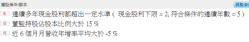 接下來再從這140檔當中,濾掉那些過去幾年曾經有較大衰退的公司,所以我在上面提到的那個腳本中,再加上下面的濾網: