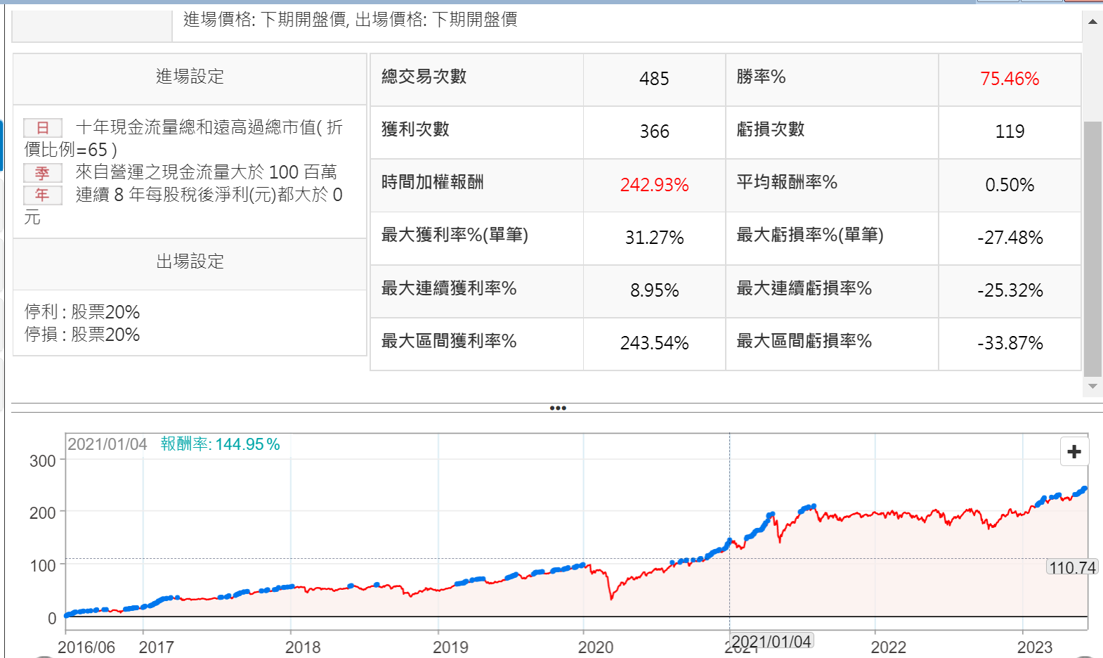 加上其他條件後,去跑所有普通股扣除營建,金融及KY股,停損停利設為20%,回測的報告如下圖