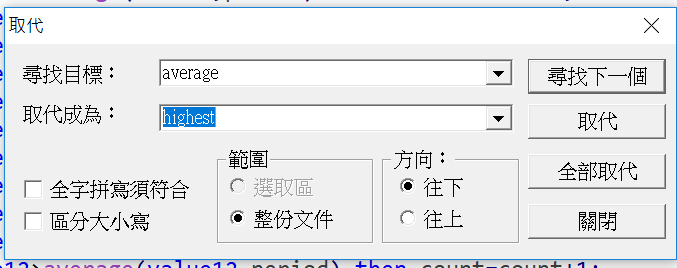 另外跟大家分享一下,在自己發明私房的0050相關指標時,可以善用”取代“這個功能,直接一次修改50行的敘述,例如我要把average換成highest就直接填完按全部取代就好了