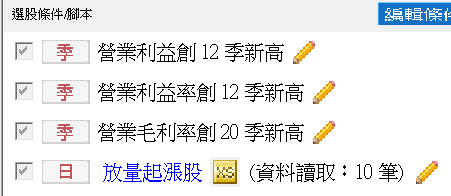 這個選股法的前三項代表本業的營運創下很久以來的最佳成績,最後一項的腳本如下