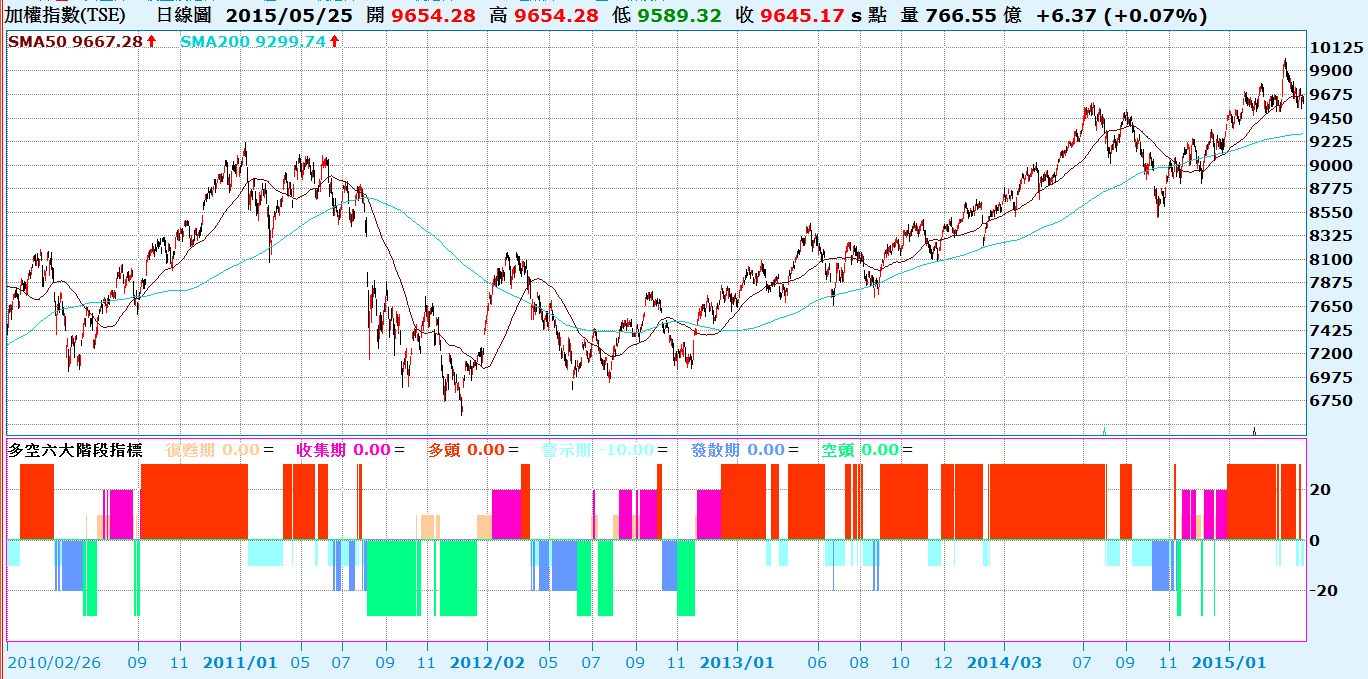 var:m50(0),m200(0); m50=average(close,50); m200=average(close,200); if close > m50 and c< m200 and m50<m200 then value1=10 else value1=0; if close > m50 and c> m200 and m50<m200 then value2=20 else value2=0; if close > m50 and c> m200 and m50 > m200 then value3=30 else value3=0; if close < m50 and c>m200 and m50>m200 then value4=-10 else value4=0; if close < m50 and cm200 then value5=-20 else value5=0; if close < m50 and c then value6=-30 else value6=0; plot1(value1,"復甦期"); plot2(value2,"收集期"); plot3(value3,"多頭"); plot4(value4,"警示期"); plot5(value5,"發散期"); plot6(value6,"空頭");