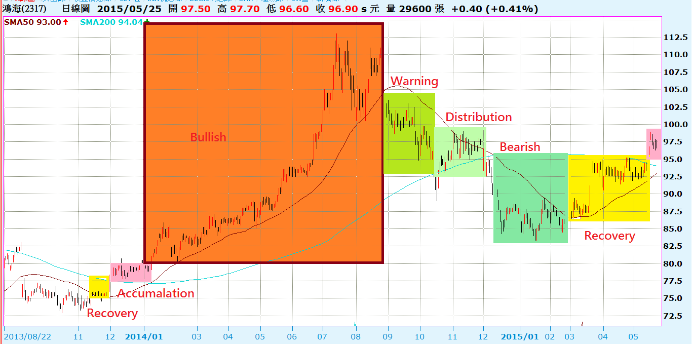 一般來說,我們會在復甦期開始小量進場,籌碼收集期加碼,多頭確立時再加碼,然後高處不勝寒時獲利了結,然後依序再加碼作空。