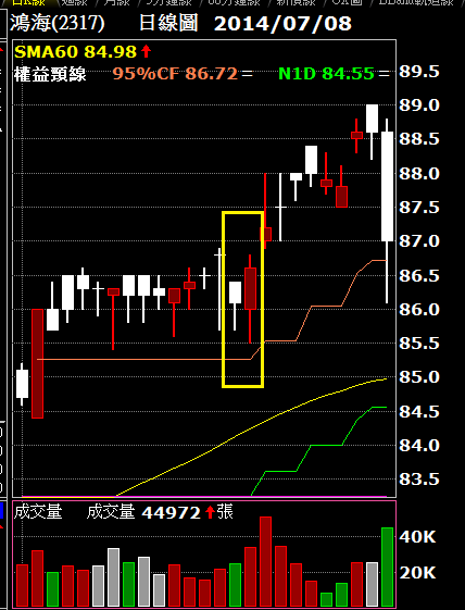 先定義多頭吞噬: 當股在在月線之上時,昨日的收盤價低於開盤價收黑K棒,今日開低且下探低點但盤中漲過昨日高點且收在昨日開盤價之上,是為多頭吞噬!