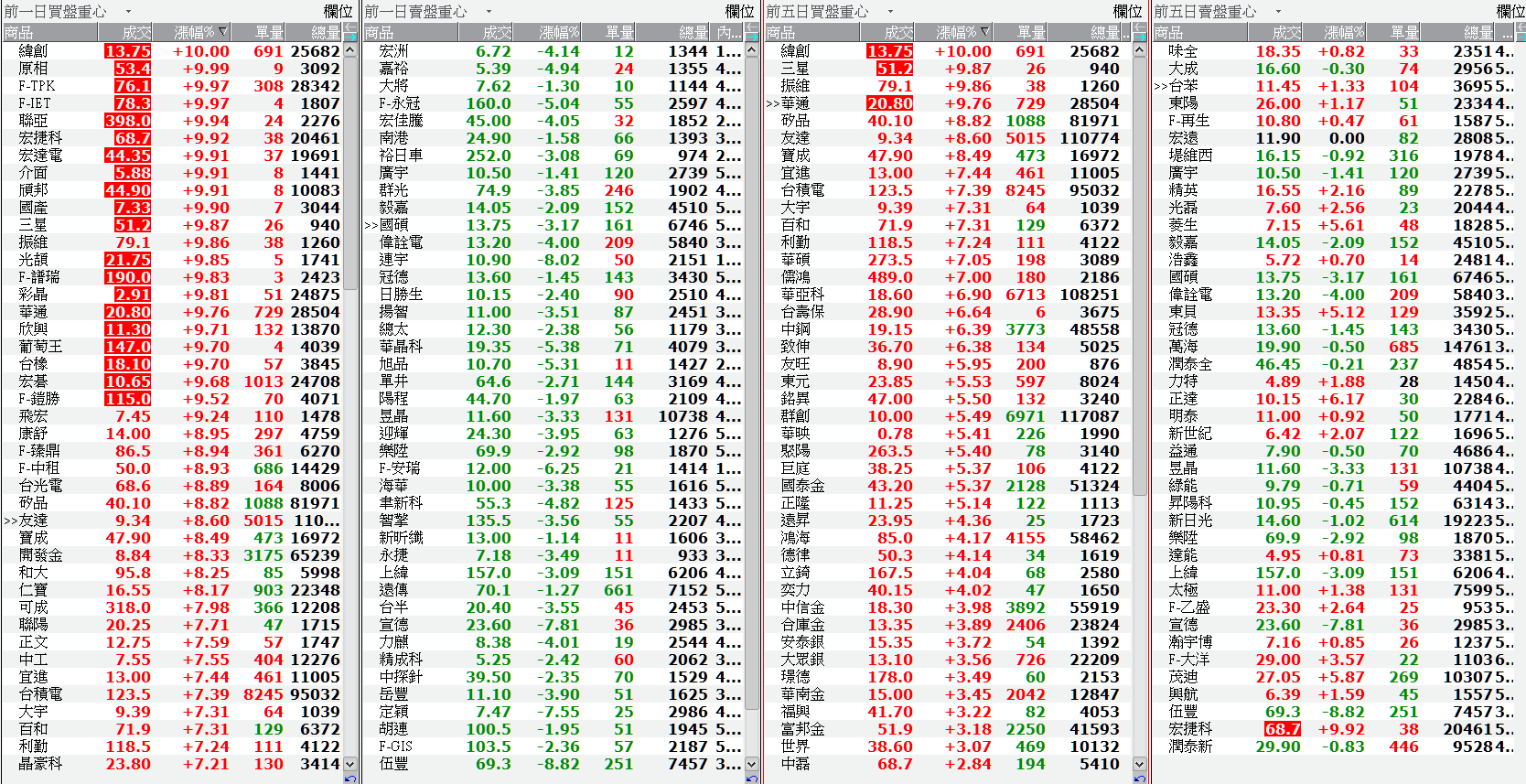 1.最天最強的,最多人買的,蠻多是之前跌最慘,賣壓最重的,像TPK,宏達電,宏捷科等