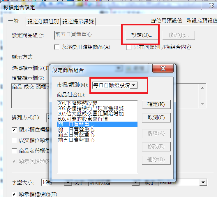 如此一來,我們就可以透過自設頁面,把這四組自動選股每天符合條件的名單,集合在同一個報價頁面中來看盤,我們可以在自設頁面中選報價組合,然後把設定商品組合的地方選擇每日自動股股清單,這時候這幾種選股法的名稱就在上面可以讓您選取了。