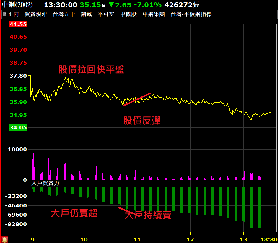 昨日的中鋼就是很好的例子,這種走勢是不管股價是漲是跌,大戶基本上就是持續的賣,愈賣愈多,從開盤就一路賣,這種通常就是有大咖的在賣股票