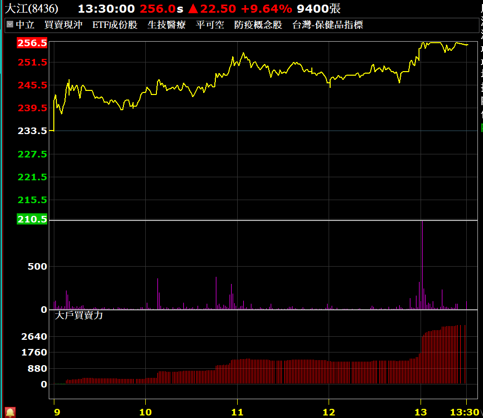 昨天的大江非常明顯,一開始大戶並沒有明顯站在買方,但之後轉買超後股價被拉高,就算股價壓回,大戶的買超都沒有減少,代表大戶一直堅定的站在買方,最終大戶就拉高作收