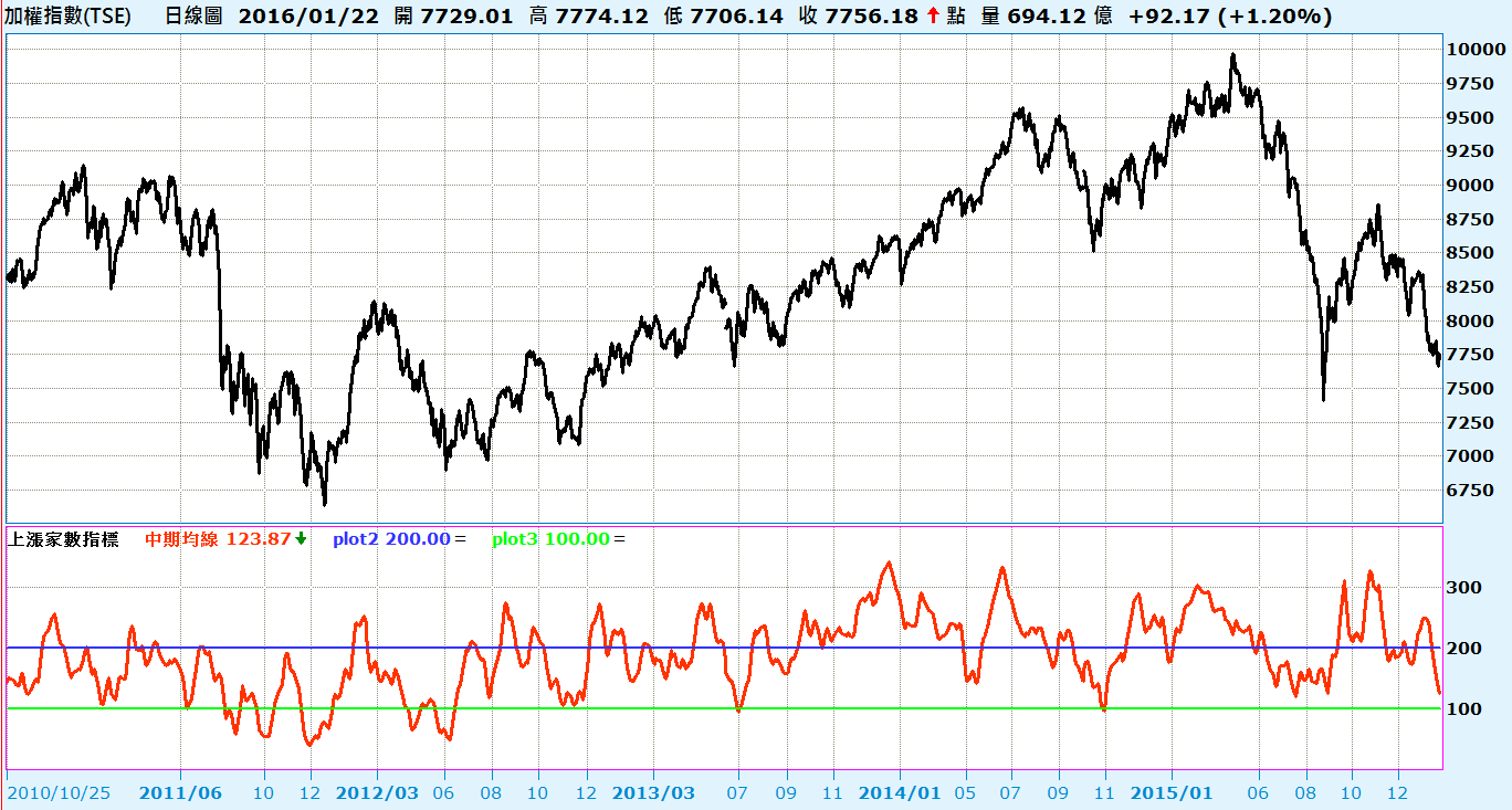 3.如果上漲的家數跌到100家以下,那麼就是屬於很空頭的情況,這時候反而可能出現反彈。