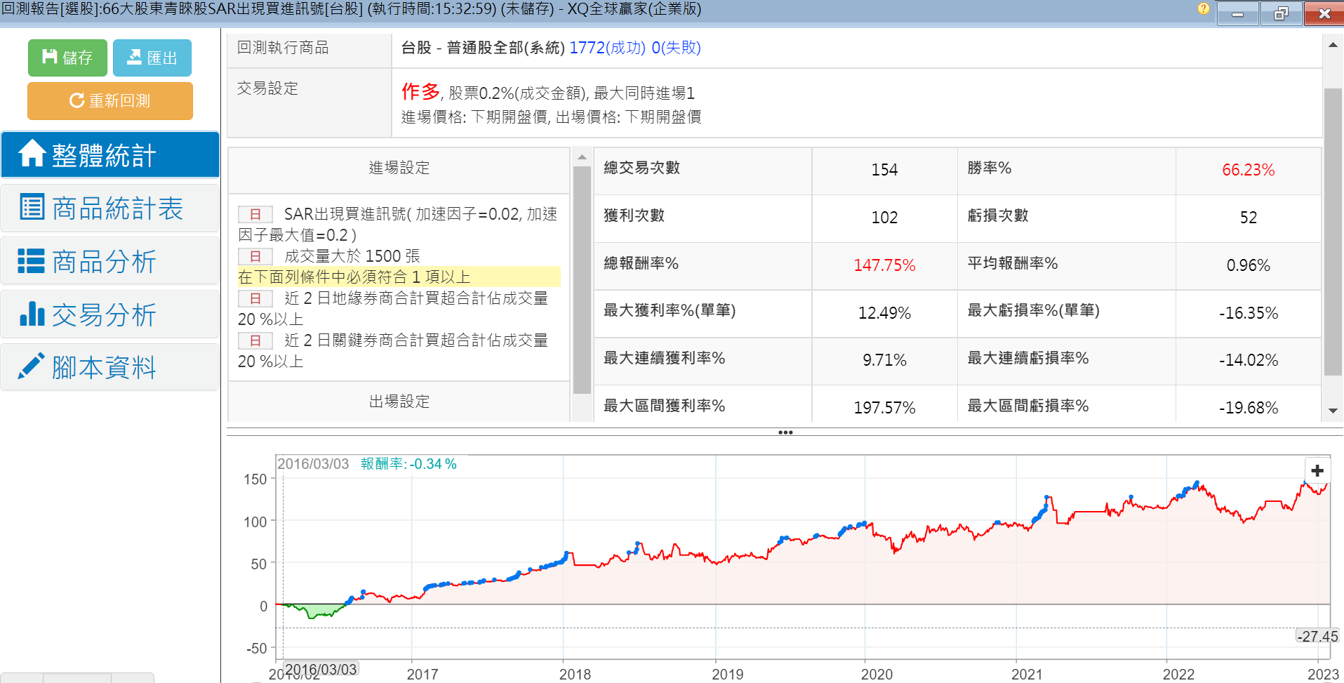 接下來我想說再增加一個蠻普遍的技術面進場時點的條件,我選的是SAR出現買進訊號。