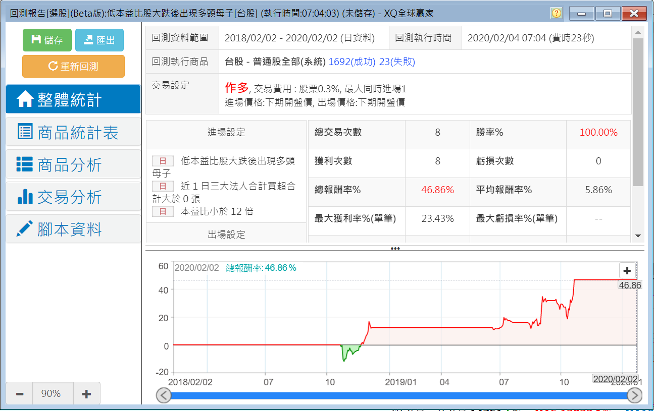 如果拿這腳本跟上述條件組合而成的策略去選股,回測過去兩年,出場點設為20天之後,回測報告如下