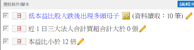 這當中除了本益比小於12及近一日三大法人合計買超這兩個條件是系統內建的之外,另外加了一個腳本型的選股條件: 低本益比股大跌後出現多頭母子,我寫的腳本如下: