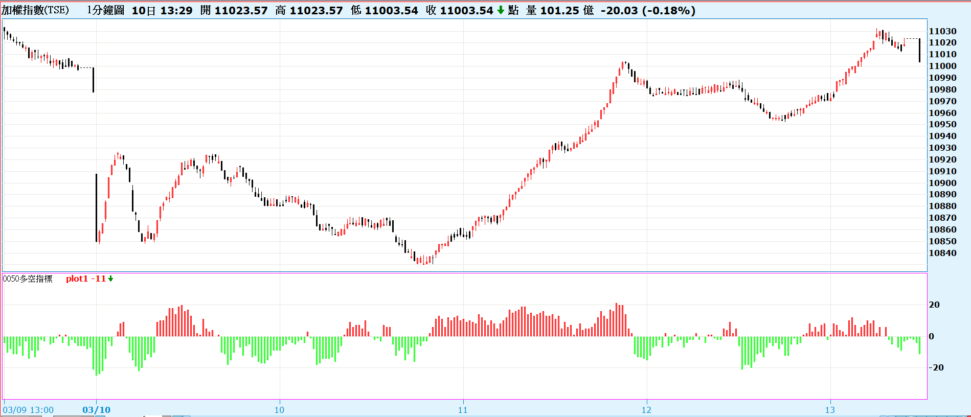 大家可以發現,這個指標在加權指數一分鐘線多空翻轉時,的確可以具備領先的預示能力,特別是盤中的一分鐘線多空轉折點前後,這個指標的訊號是非常明確的。
