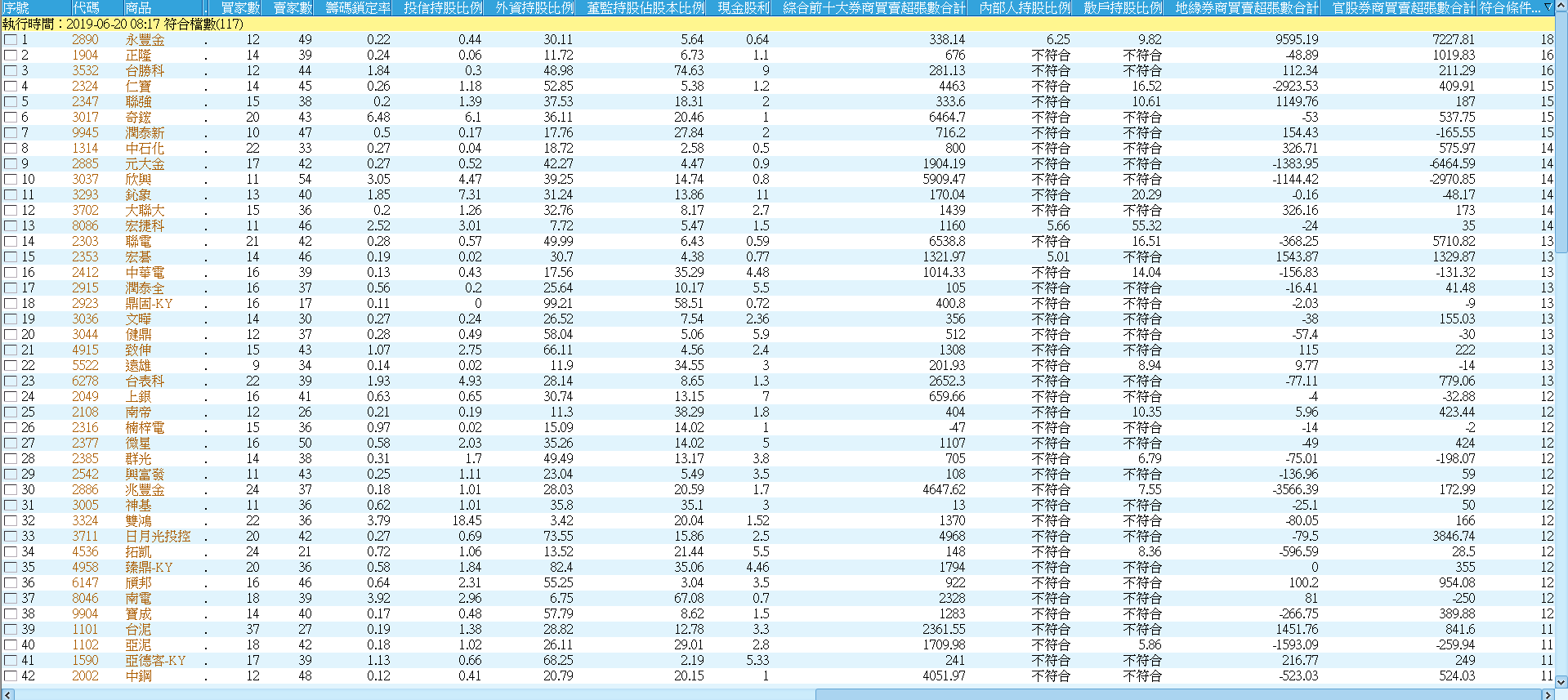 然後我是設定要符合10個條件以上的才列出來,以昨天收盤的數據為例,挑出來的股票清單如下