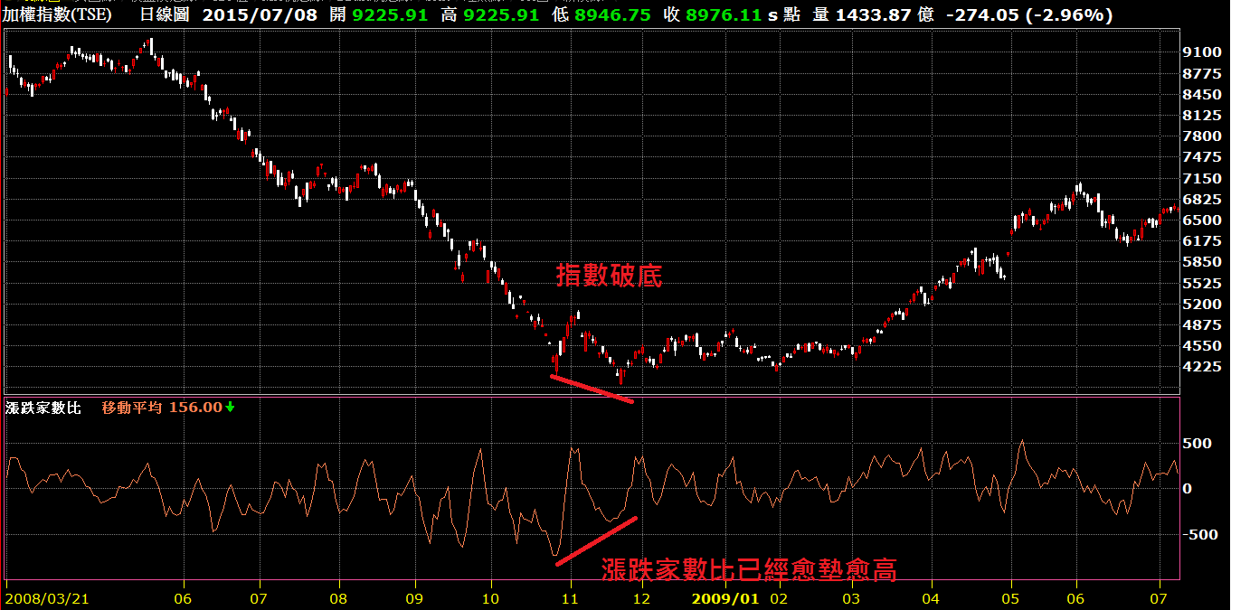 以上圖為例,上一次次貸風暴後,指數還在破底,這個指標已經翻揚了,代表指數在跌時,上漲的家數與漲停的家數已經比先前高了,這代表追價,翻多的力道比先前強了,這是一個很重要的打底訊號