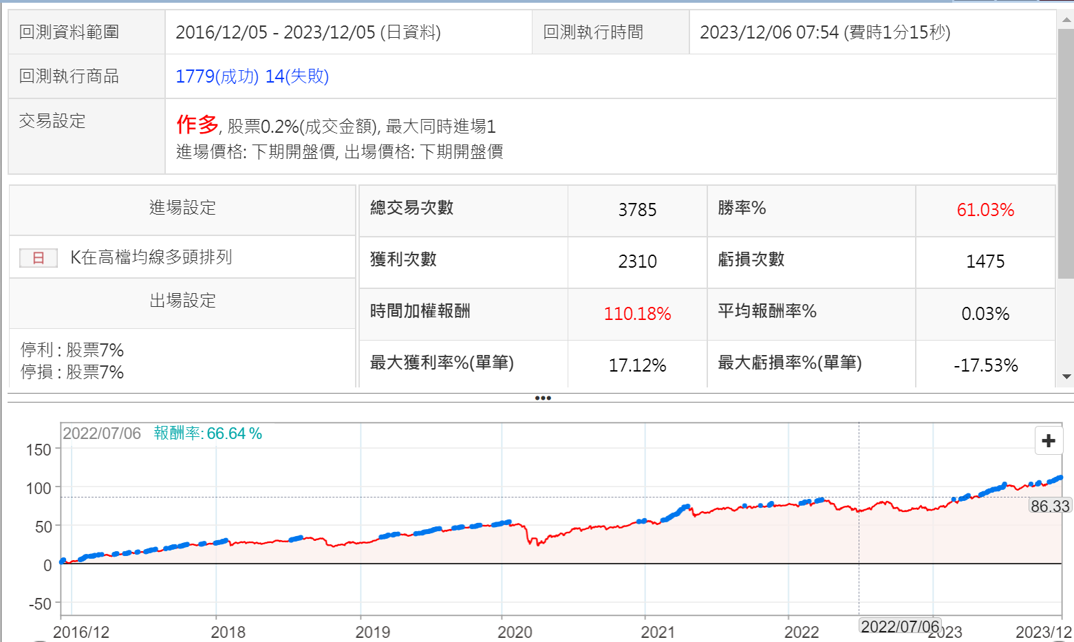 這個腳本去回測,一樣是跑所有普通股,停損停利都設為7%,回測報告如下圖: