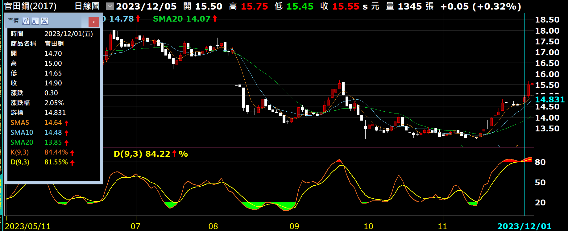 最近其中一個符合這個腳本的股票是官田鋼 ,它的K線圖如下圖: