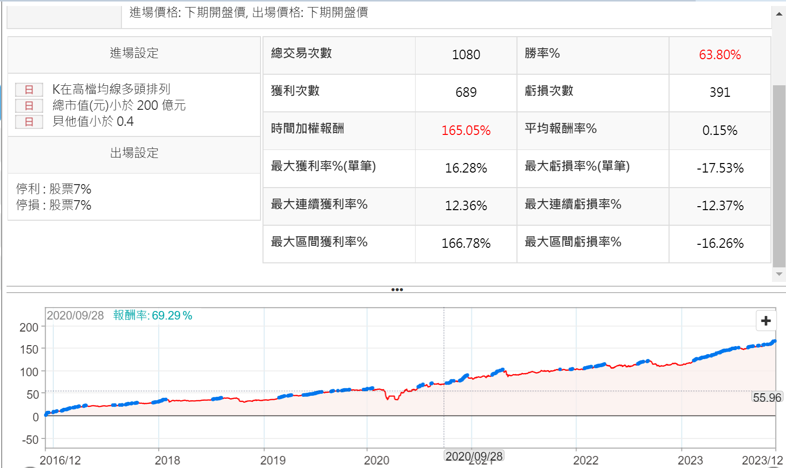 例如我加上因子投資常用的貝他值跟總市值夠低的條件,回測結果就變成下圖這樣: