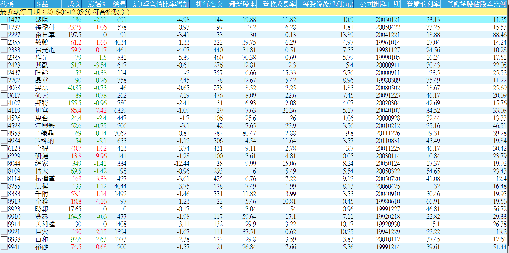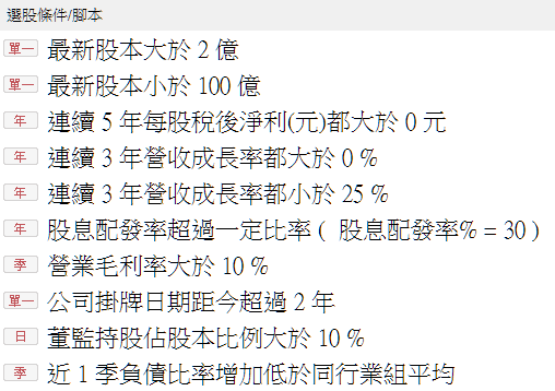 我根據文章上的選股條件,把可以量化的條件,用XS想根據他所列出來的五要十不去挑股票,我設的選股條件如下: