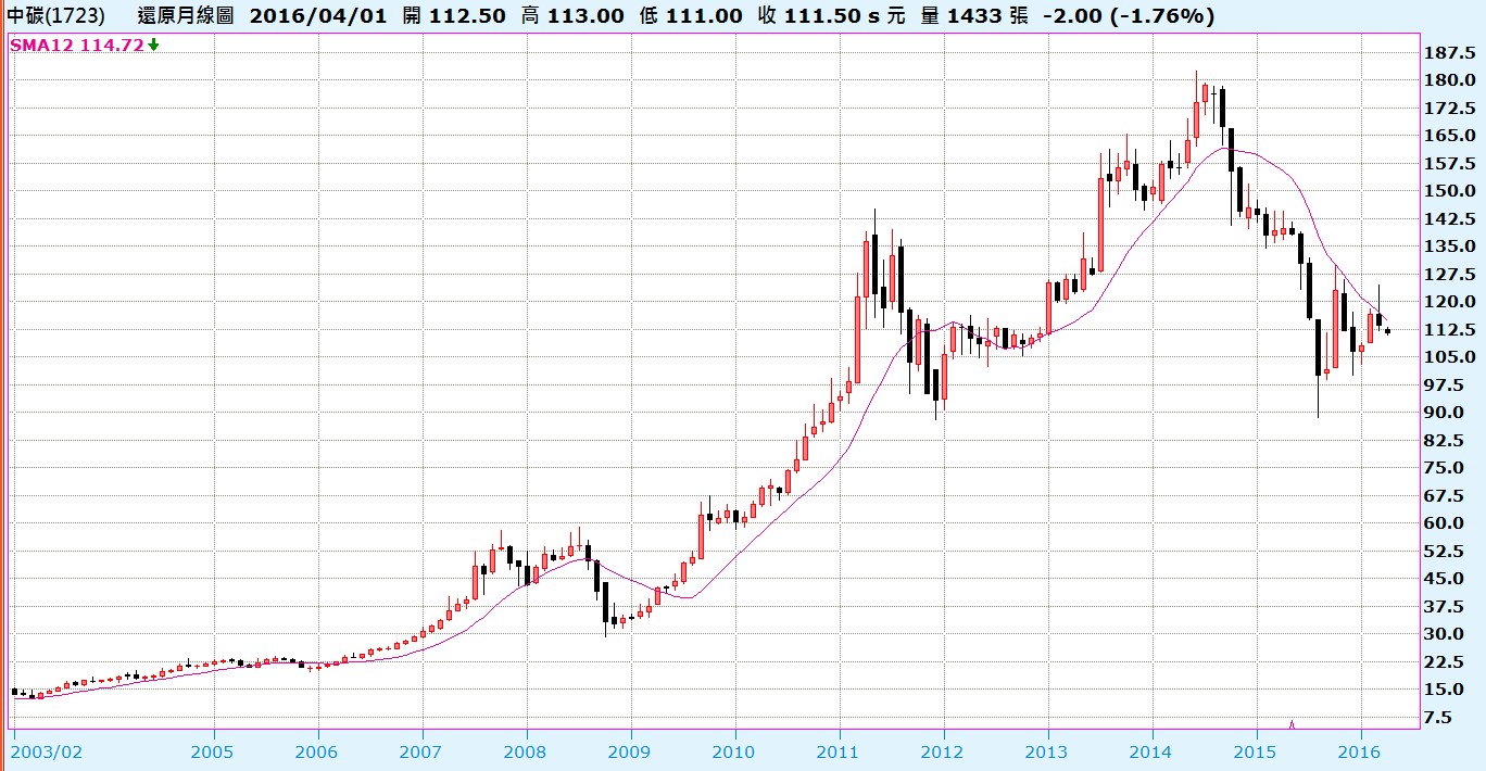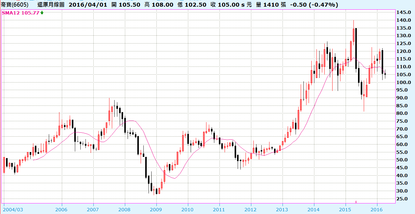 如果對於基本面的變化沒有太大把握,我會建議用還原月線來當作波段的買賣指標,以中碳跟帝寶為例