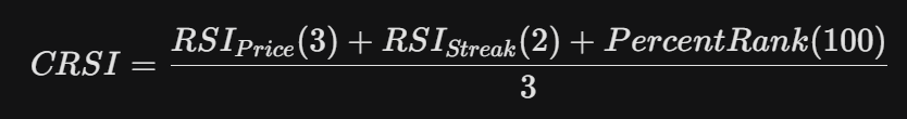 CRSI 的數值範圍與傳統 RSI 一樣是 0 到 100,但它的底層公式是由三個完全獨立的動能元件取算術平均而成: