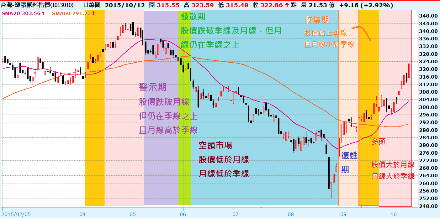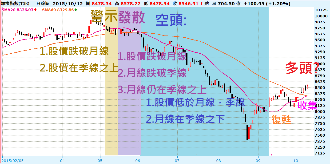 我們從多頭及空頭架構的股票,可以發現,受惠於台幣貶值的外銷股,景氣到底的塑化股,以及跌深且旺季到的電子股,目前是處於多頭走勢,金融股,航空股及部份先前比較強的個股則處於空頭走勢。