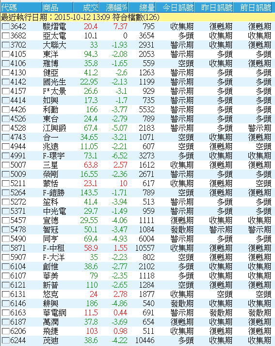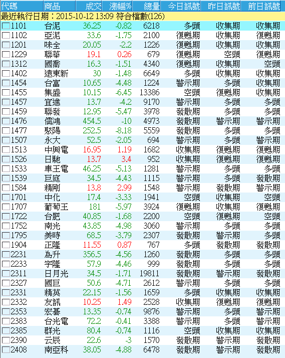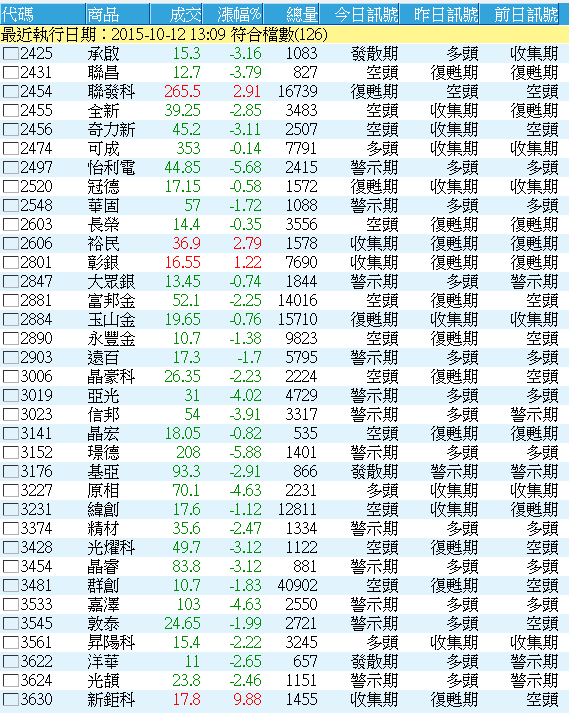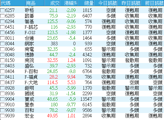 這個腳本可以找出最近一日訊號跟前一日不同的股票,以下幾張圖就是根據上述的腳本跑出來的,有的變好,有的變壞,加減參考囉。