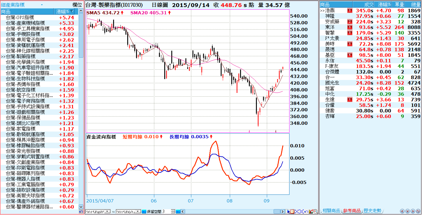 然後再把這個數值算出兩個移動平均,透過不同天期的移動平均,來觀察特定產業資金流入流出的情況。