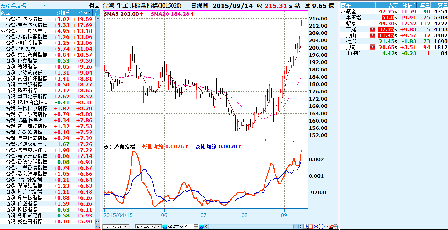 為了尋找資金在各細產業間的流動狀況,我寫了一個資金流向指標,腳本如下: