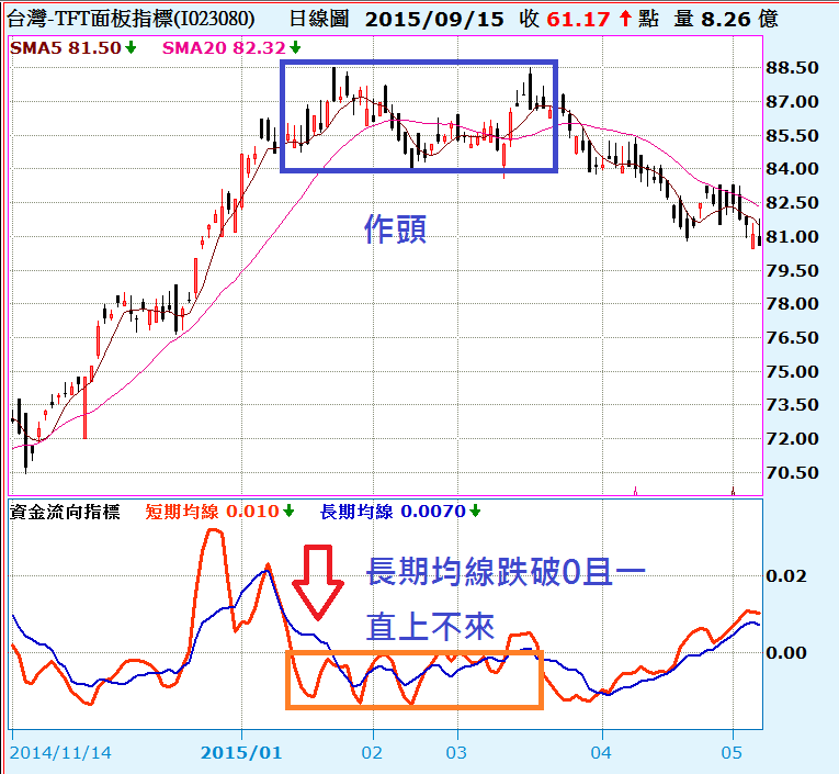 例如今年初面板股上漲時,指數花了兩個半月作頭,但資金流向指標則很明顯的,一直處於零之下,代表資金在持續流出。