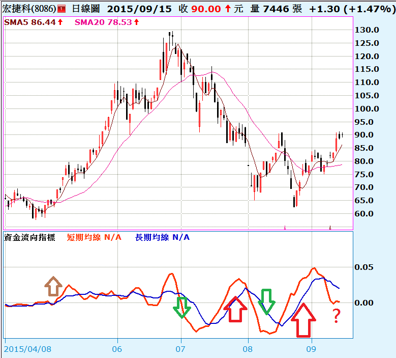 上圖即是宏捷科這檔熱門股的資金流向指標與股價對照圖