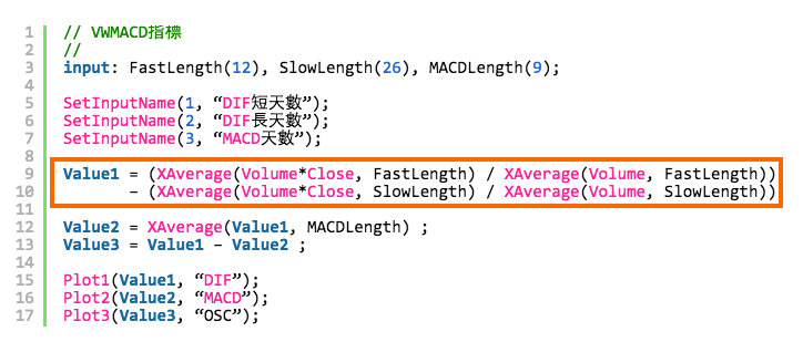 成交量加權MACD指標 (VWMACD) By 發財橘子 | 2015-05-01 0 Comment 分享 最近有使用者問到了XQ系統內有沒有成交量加權MACD指標(Volume-weighted MACD)。雖然這個指標並沒有內建在XQ內,可是我們也可以用XS來完成。 成交量加權MACD指標與一般MACD指標的差異,是在計算移動平均價時把成交量也考慮進去,在底下我們修改原先MACD指標內計算移動平均的部分。 有興趣的朋友可以參考一下。 分享