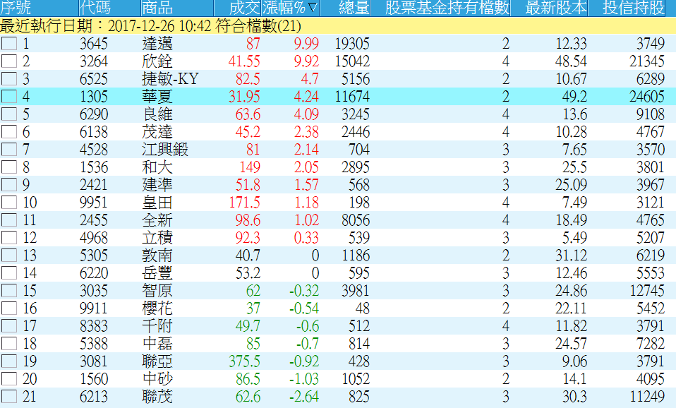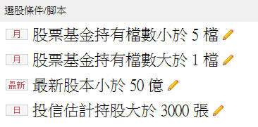 這些條件會挑出只有少數基金持股,且張數不小的中小型股,其中比較特別的是XS Support了股票基金持有檔數這個選股欄位,這個欄會是計算有幾檔基金持有該檔股票,透過這個欄位,我們可以挑出那些股票是少數基金在重押,下面就是電腦挑出來的股票