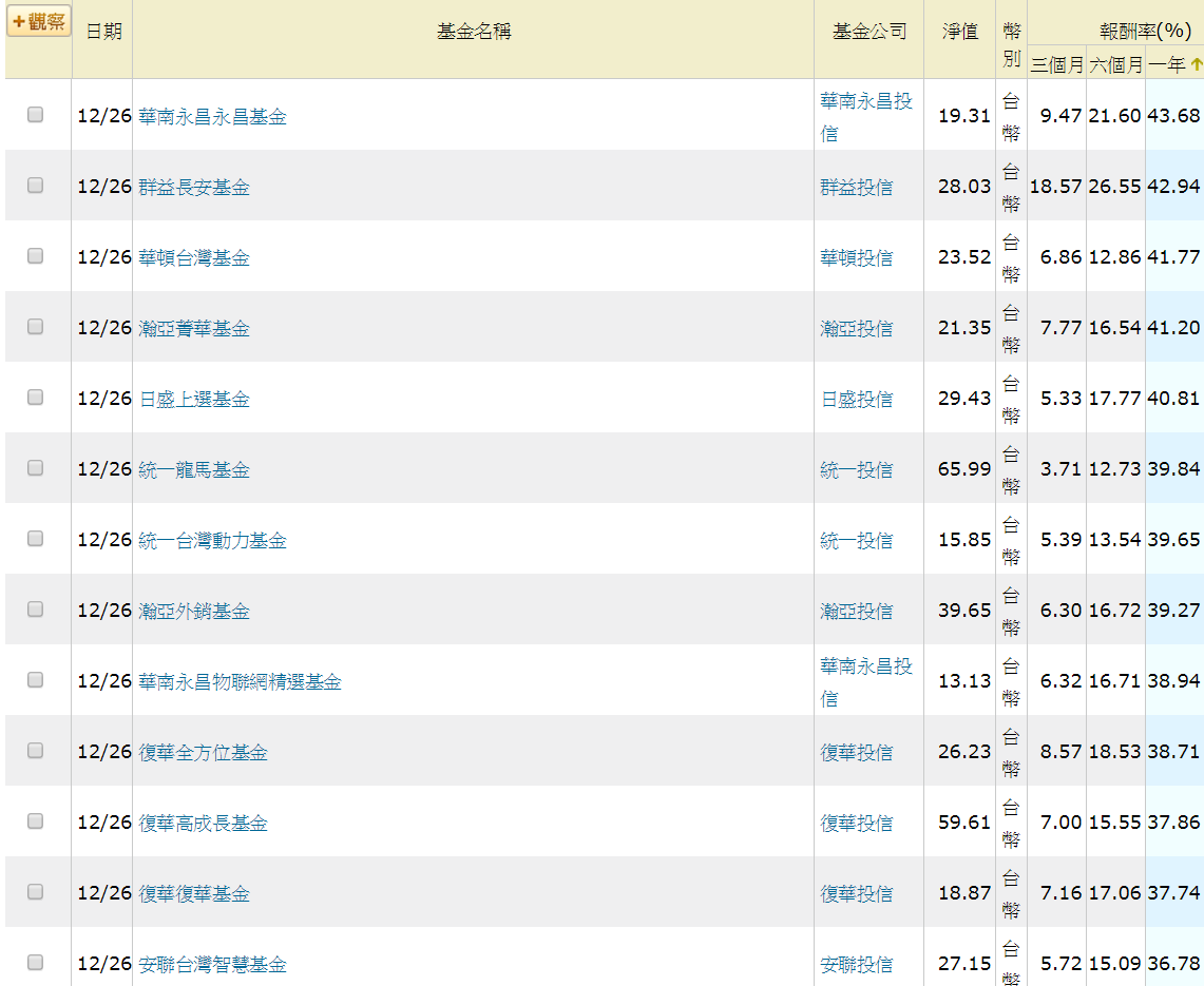 年底會不會有投信的作帳行情,要先看投信績效排名的競爭情況,底下這張圖是目前台股一般股票型基金績效在前在的名單
