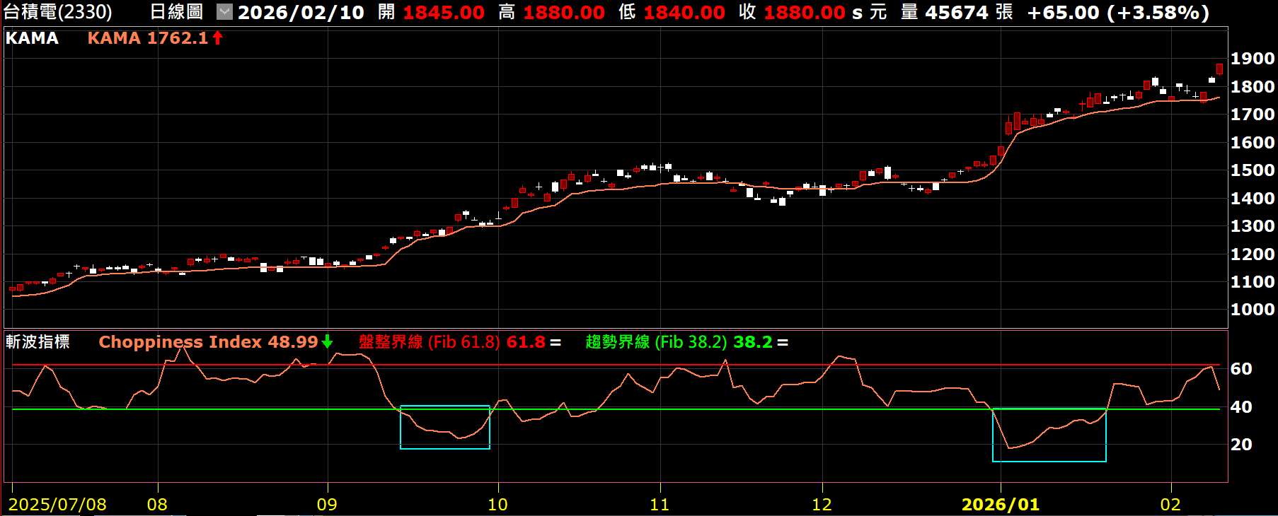 附圖是跟KAMA一起對照的斬波指標,在確認趨勢這件事上,斬波指標的確有其獨到的地方