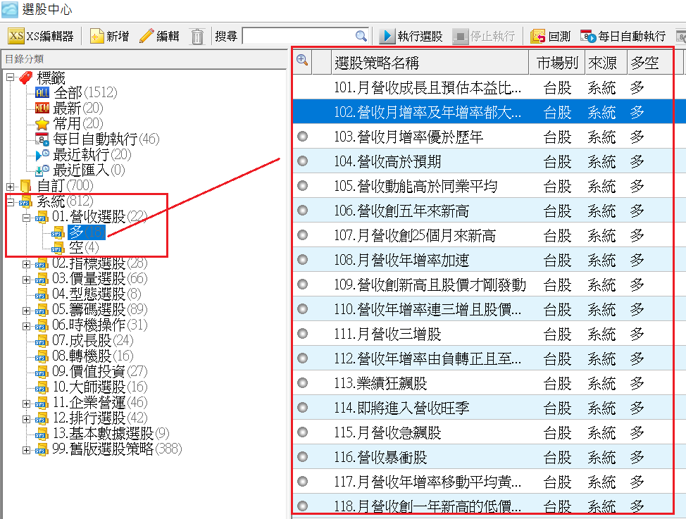 這18種月營收的選股策略,在打開選股平台後,可以在像下方的畫面裡找到
