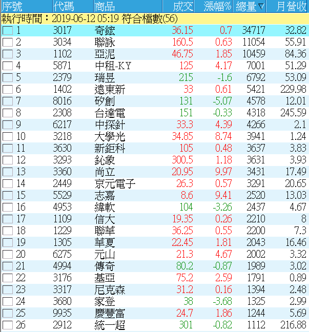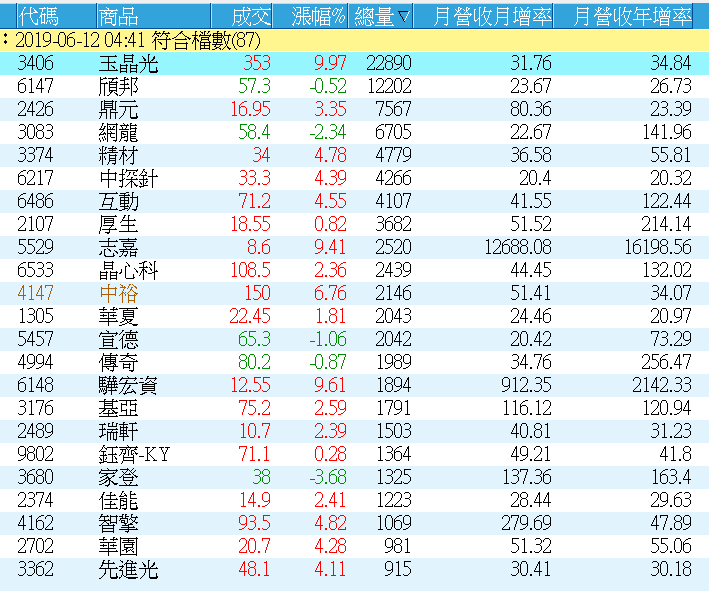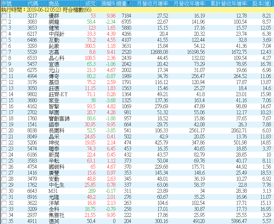 這類股票表示營收不因為出貨日的差異而造成的營收成長,而是貨真價實的成長,以下是符合這個條件裡成交量較大的股票,特別是如果前兩個月營收也是成長,那就真的是基本面有些正向的變化,值得再深入研究。