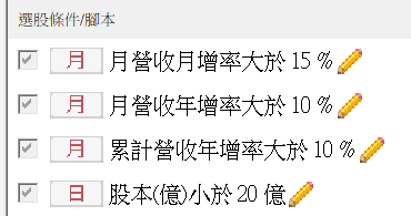 這個選股策略是在尋找那些中小型股裡的成長股,選股條件如下