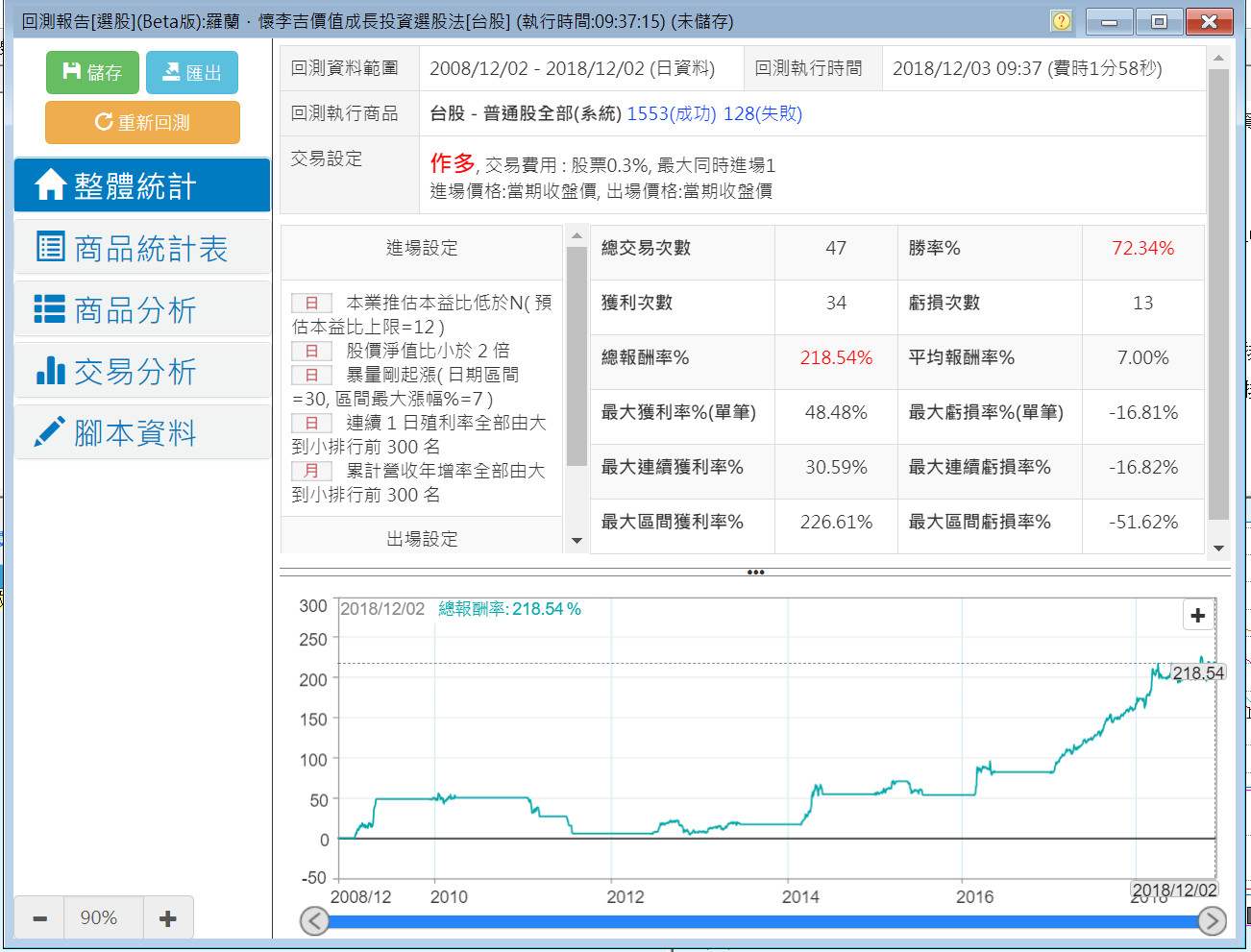 價值型投資與成長型投資,原來是截然不同的概念,但如果我們去尋找那些低本益比,低PB的股票,然後如果這些股票的殖利率與累計營收成長率都在所有股票中的前300名,而且開始呈現出量起漲的走勢,那麼這種具有價值型概念的成長股,從回測的數字上看,波段持有,有頗高的勝率,是一個值得深入研究的選股策略。