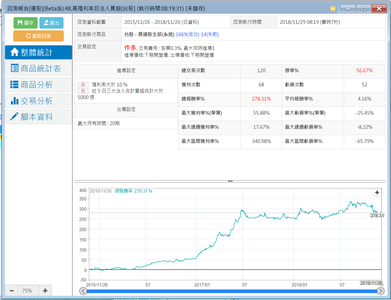 我把這個選股策略拿去回測所有股票,設二十個交易日後出場,過去三年的回測報告如下