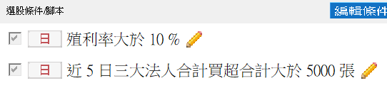 我想挑出殖利率大於10%而且近五天裡三大法人合計買超大於5000張的股票,我認為這是夠便宜且市場認同的標的