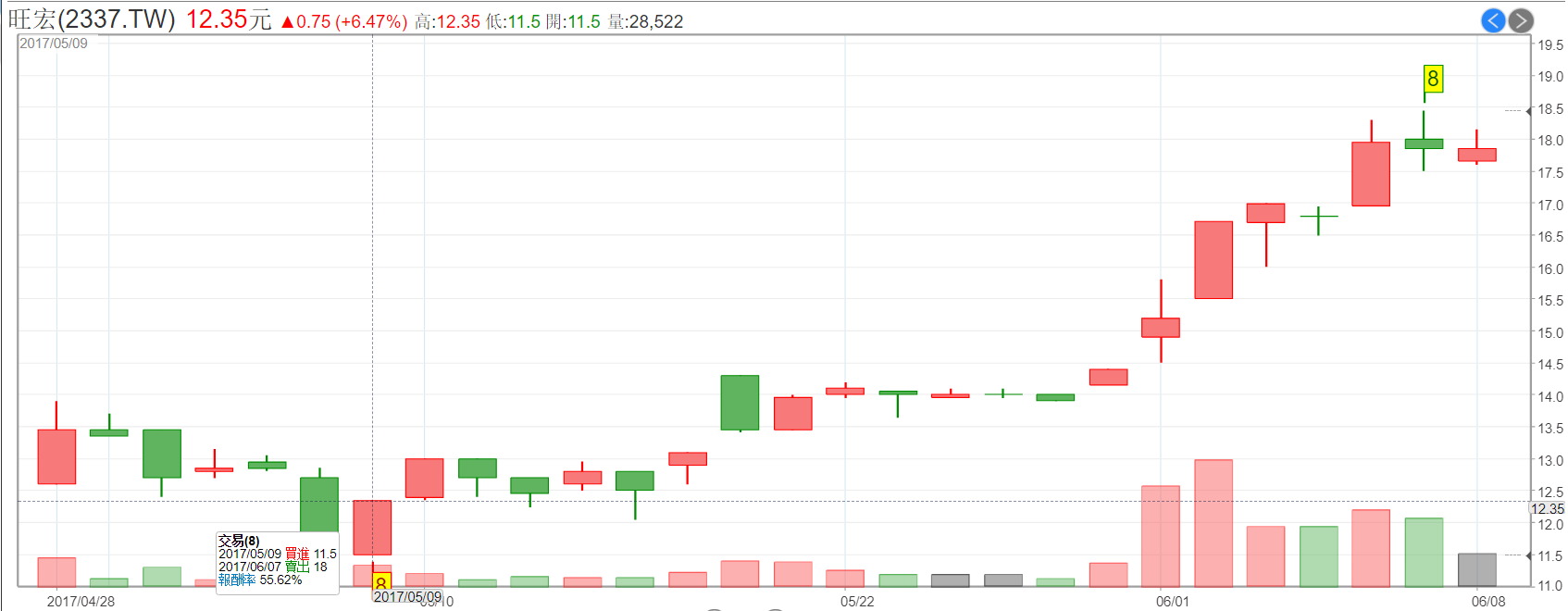 比較典型的,是像下面這檔旺宏這種出訊號前漲幅不大且標的本身不算法人常用來跟指數連動的權值股