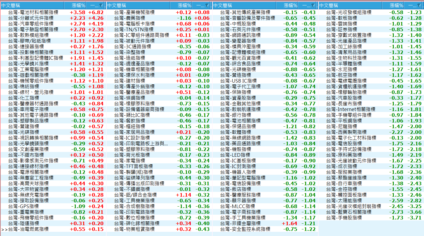用過XQ的朋友都知道,XQ有編制了一整套的細產業指數,所以我們隨時可以像底下的這個頁面一樣,了解細產業指數的漲跌變化。