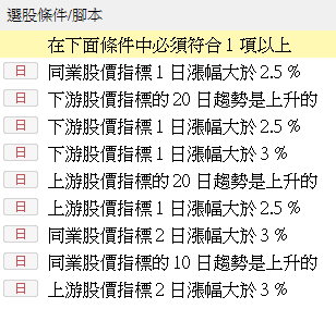 二,XS以產業視野來設定的選股策略是同行業的上中下游股價指標,XQ系統上原本對每一檔股票,都會找出它的上游,同業及下游企業,這些企業不一定是台股,也可能是美股,A股等等,我們把這些企業,用漲跌幅簡單平均的計算方式,編制成價格指數,如此一來,每檔股票,每一天都可以計算出其上游,同業及下游股票的價格指標,如此一來,我們就可以每天找出任何一檔,其上游,中游或下游企業股價出現異常波動的個股,例如我設定如下圖的選股條件