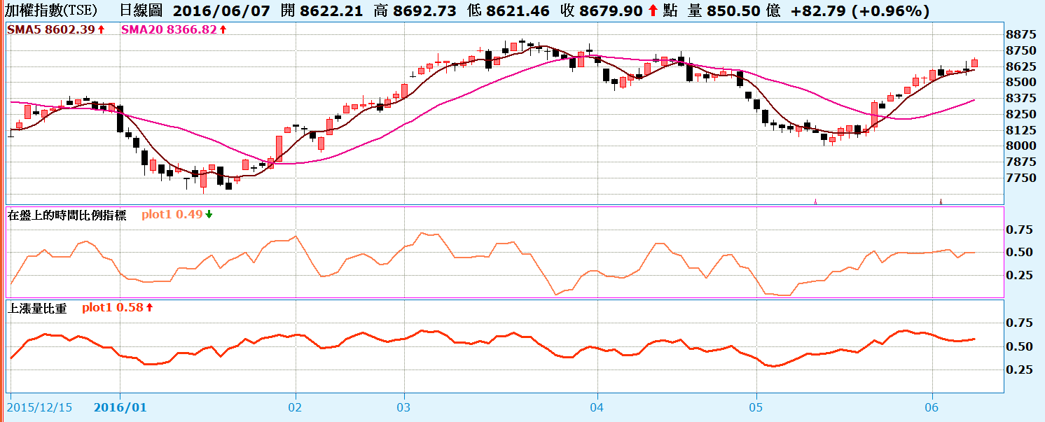 要算盤上成交的比例,XS有內建一個欄位叫上漲量,所以我就寫了一個簡單的自訂指標腳本