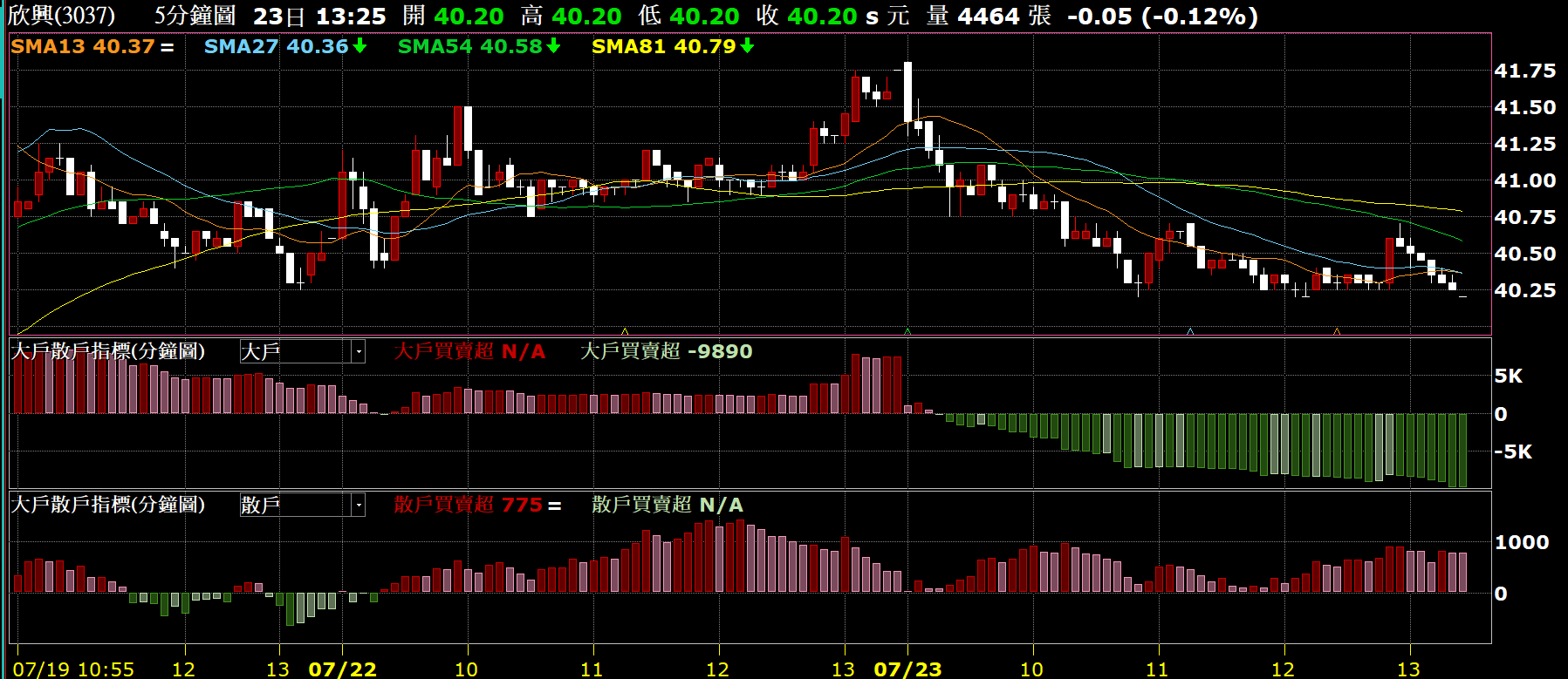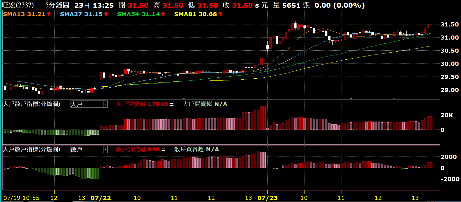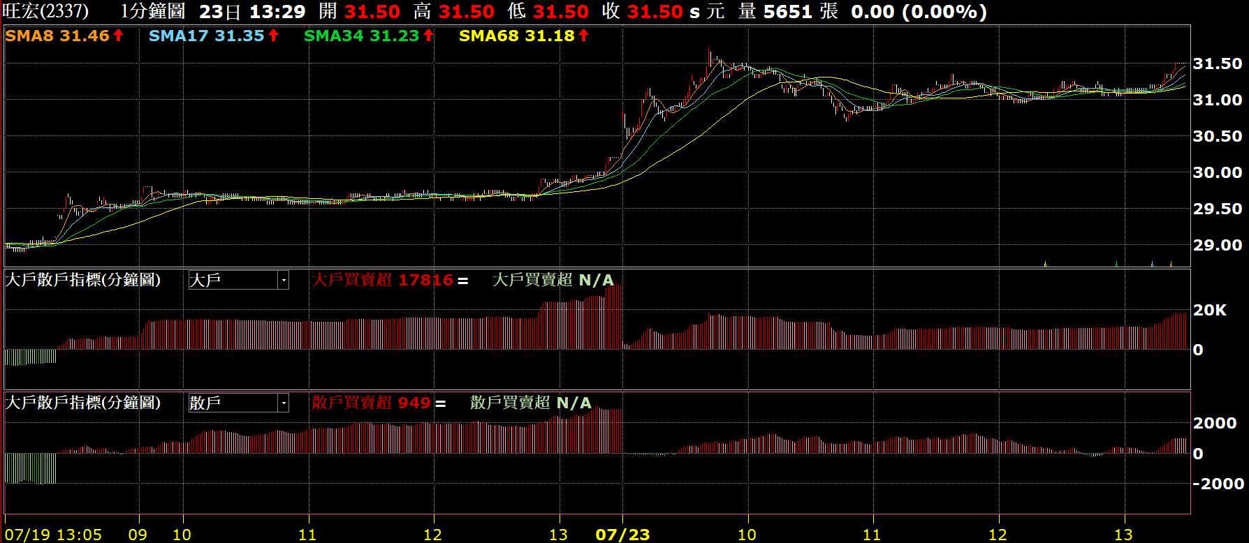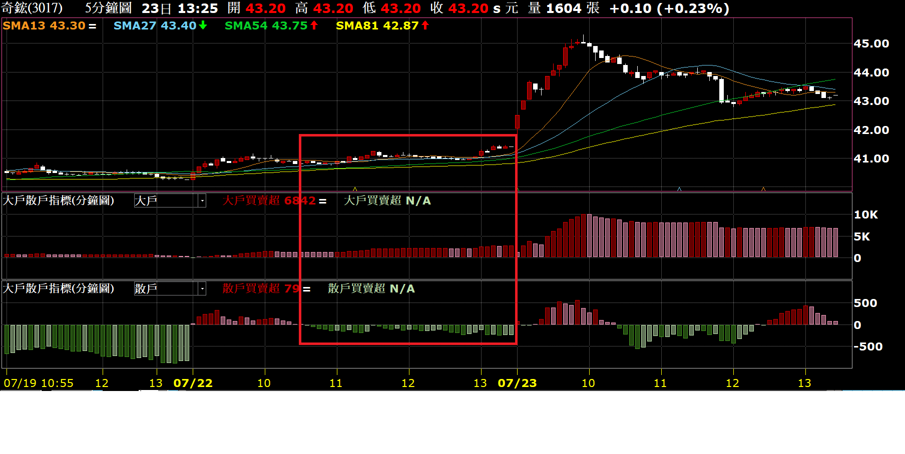 以上是在分鐘K底下所呈現的大戶及散戶買賣超指標