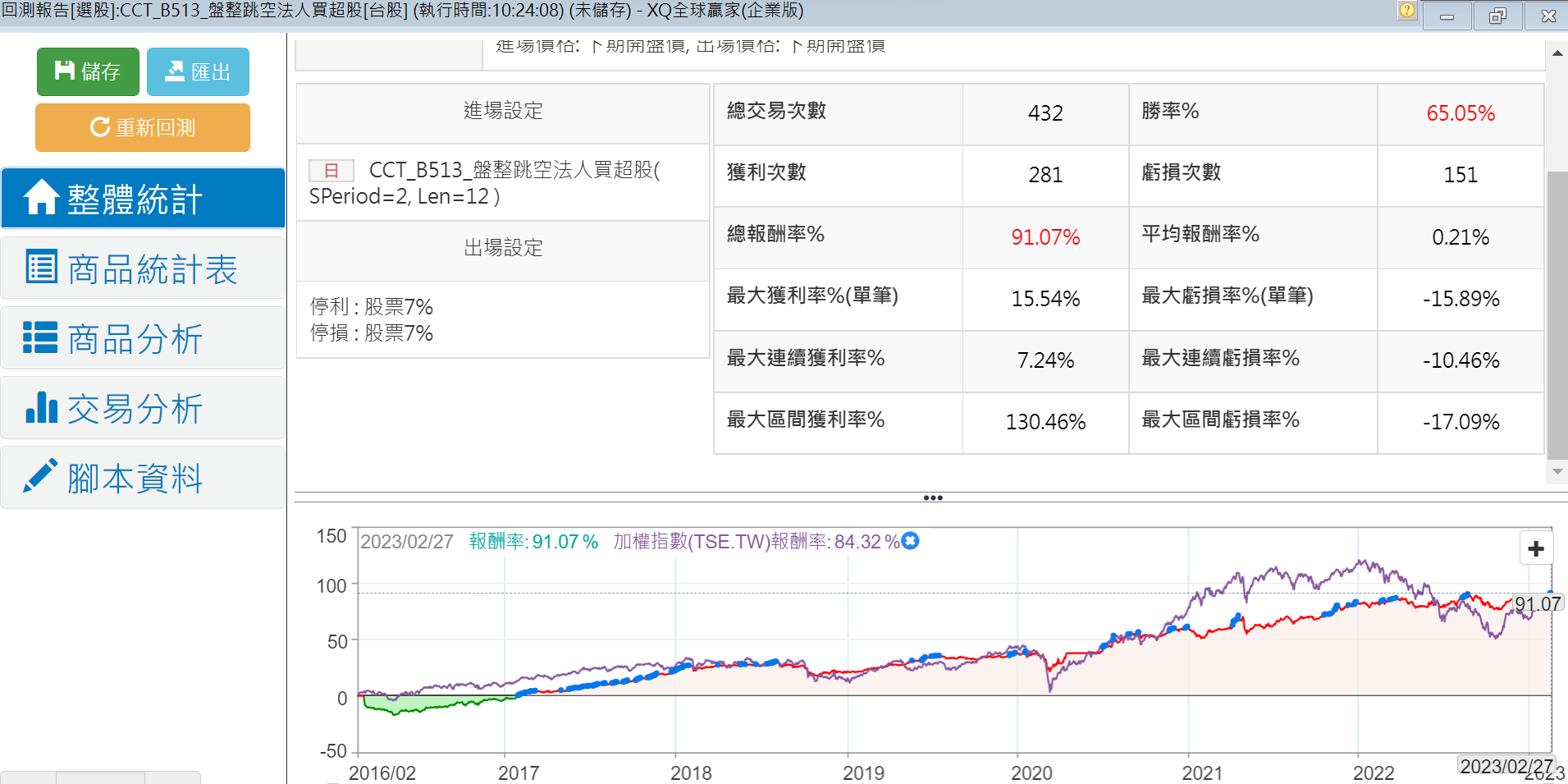 拿這個腳本去回測過去比年的所有普通股,停損停利設為7%,回測報告如下圖