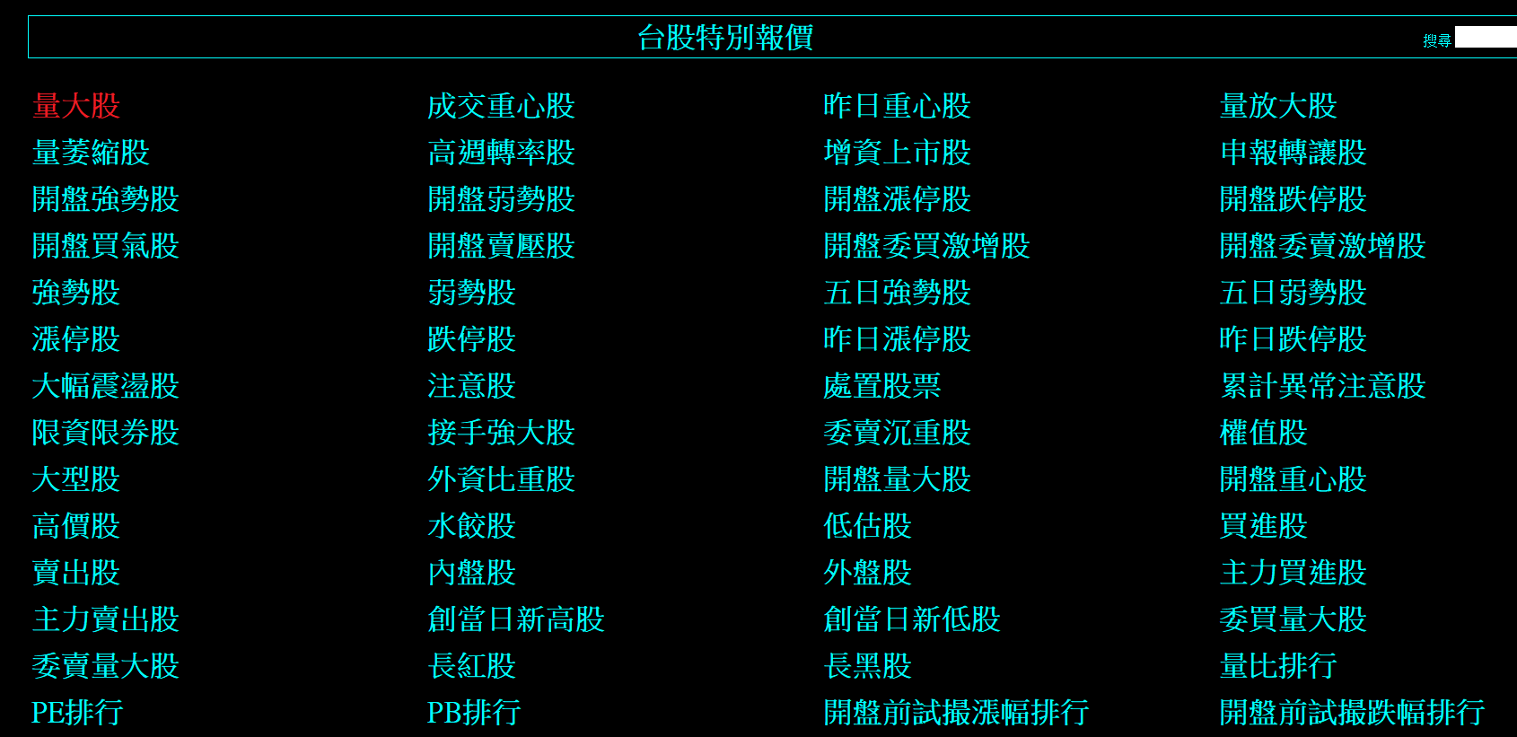 這裡面包括了型態選股,法人推荐股及殖利率排行榜