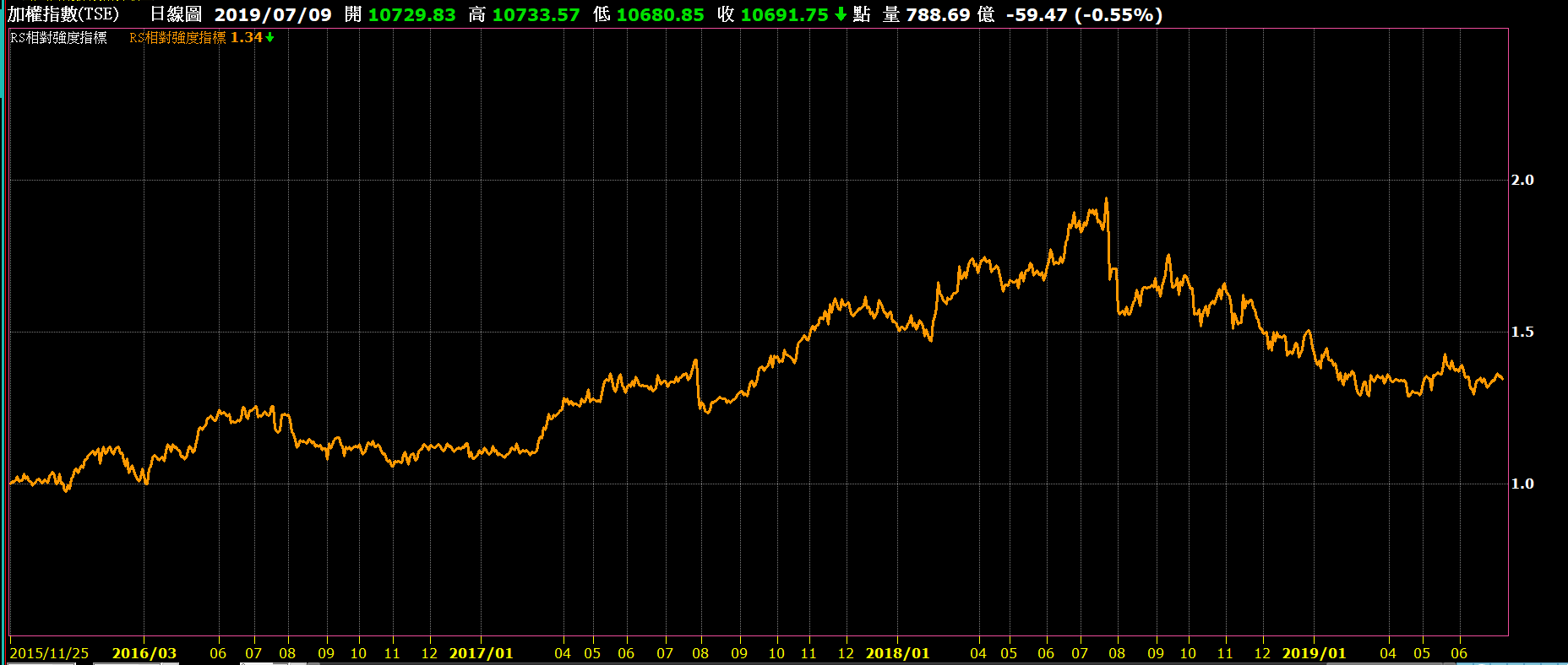 例如下面這張圖是統一超商的股價與全家的相對強度