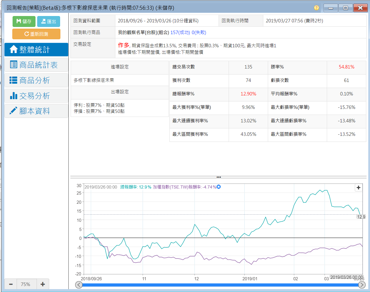 用這個腳本去跑先前介紹過的觀察名單,近半年的回測,停損停利都設為7%,回測報告如下