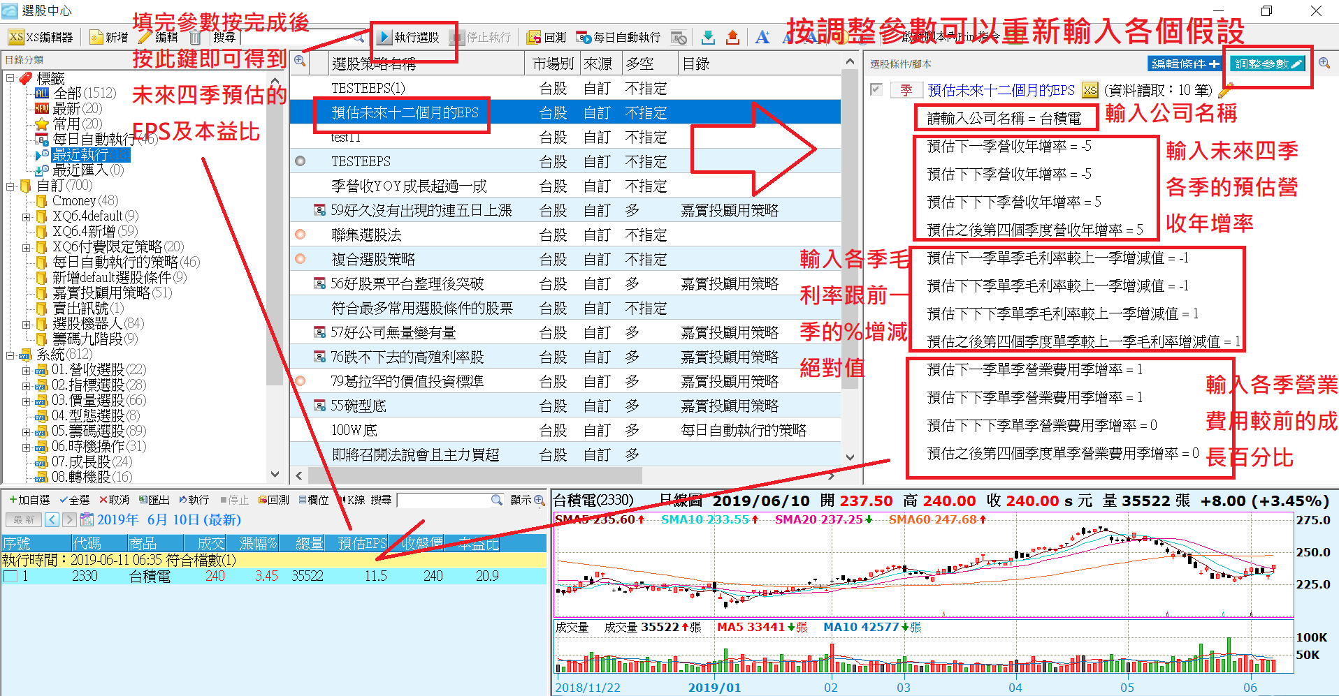 這個腳本是讓使用者把股票名稱及相關數字輸入後,讓電腦直接算出預估的EPS及以目前股價計算的本益比,把這個腳本拿去選股平台跑時,就像下面這個畫面